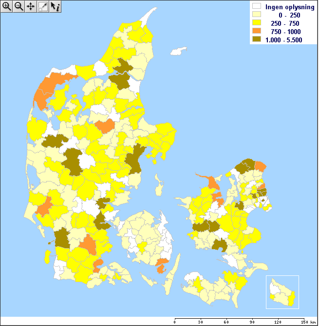 Der er i gennemsnit 1,4 km kommunevej pr. km² i Danmark.